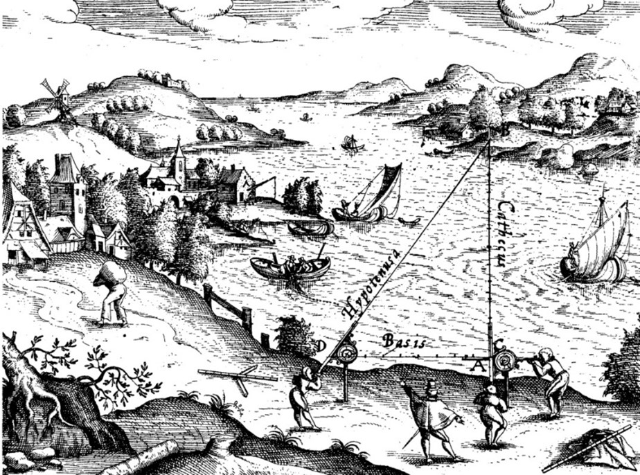 Snell, encore appelé Snellius, semble-t-il avec son accord, est né dans la province d’Utrecht et à vécu à Leyde. Fils d’un mathématicien renommé, il a découvert en premier (1621) la loi de la réfraction de la lumière lorsqu’elle change de milieu. Descartes publiera cette loi en 1637, en annexe de son Discours de la méthode. La loi de la réfraction porte d’ailleurs le nom de loi de Snell-Descartes ; sur ce point, pour être complet, la réfraction est déjà présente dans les travaux des mathématiciens arabo-persans du Xe siècle. L’ouvrage majeur de Snell, en latin, s’intitule Erathostenes Batavus de terrae ambitus vera quantitate. Il est publié en 1617, et il y détaille les opérations géodésiques entreprises pour mesurer l’arc de méridien compris entre sa ville, Leyde, et Soeterwoode, dénommée maintenant Zoeterwoude, en Hollande du sud. Il s’agit de la première utilisation en vraie grandeur de la méthode de triangulation, qui sera ensuite amplement employée à partir du XVIIe siècle par Jean Picard ou la famille Cassini, et qui sera à la base de la mesure du mètre par Delambre et Méchain sous la Révolution française via le méridien Dunkerque – Barcelone.