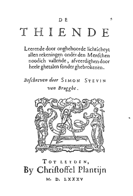 Stevin est d’origine comptable, domaine dans lequel il applique avec succès son système. Il publie sa généralisation décimale dès le XVIe siècle en comptabilité, dans un livre nommé Die Thiende (La Disme) publié en 1585 à Anvers chez l’éditeur anversois Christophe Plantin. Il plaide également pour l’application de la base dix aux poids et mesures, deux siècles avant la Révolution française.