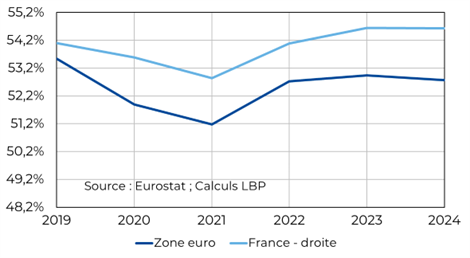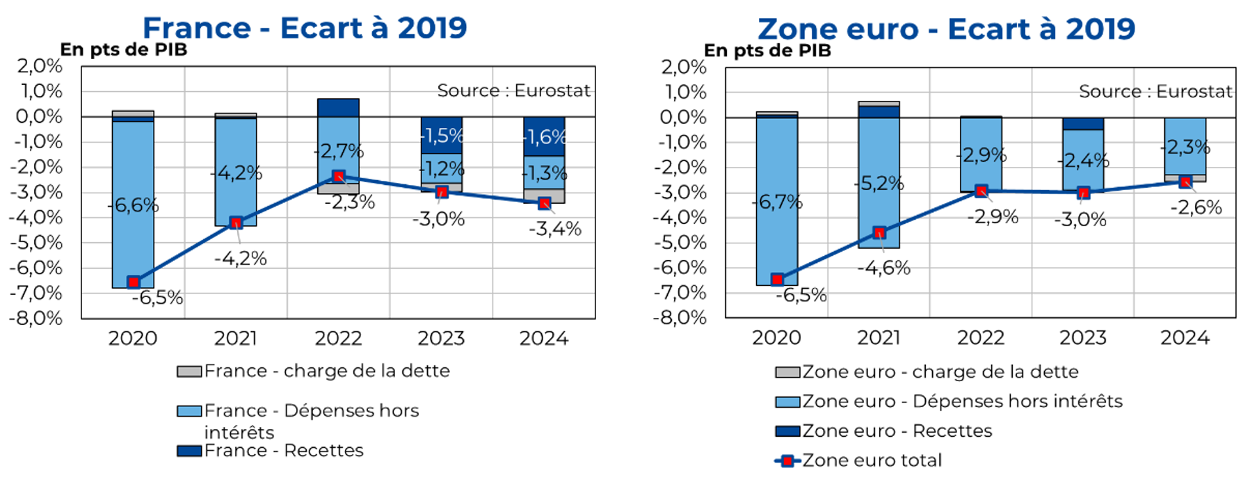 Depuis 2022, le décrochage marqué des finances publiques émane presque totalement de la faiblesse des recettes publiques, alors que les dépenses ont été mieux maitrisées que dans le reste de la zone euro.