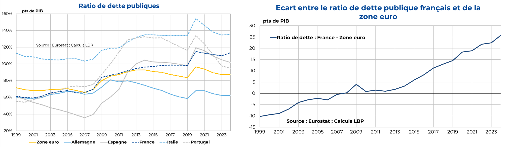 Note : Graphique à droite : écart entre la valeur du ratio dette publique française et celui de la zone euro entre 1999 et 2024