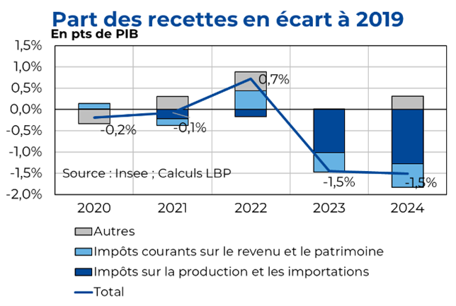 Le décrochage des recettes publiques entre 2019 et 2024 (cf. graphique 10) provient pour grande partie d’une évolution des impôts de production, y contribuant à hauteur de -1,3 pt de PIB.