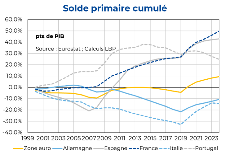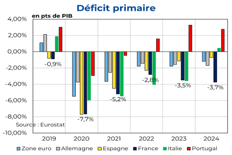La volonté publique, évidement légitime, de préserver au mieux le tissu économique face à la crise du Covid puis à celle inflationniste a impliqué un creusement marqué des déficits de la zone euro. Mais, alors que la majorité des grandes économies de la zone euro ont continué d’améliorer leur situation après la crise inflationniste de 2022, la France s’est distinguée par un nouveau creusement du déficit primaire en 2023 et 2024, ce qui en fait l’un des plus dégradés de la zone euro (-3,5 pts et -3,7 pts resp. ; cf. graphique 6).
