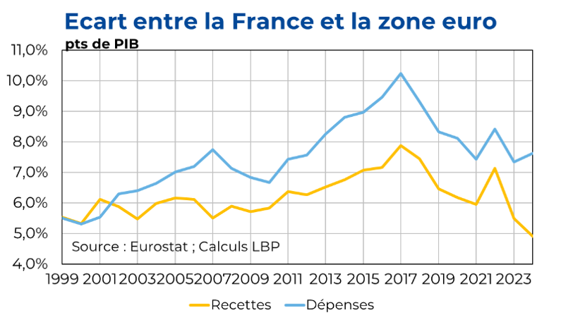 Graphique 4 : Recettes et dépenses publiques de la France en écart à la zone euro.
