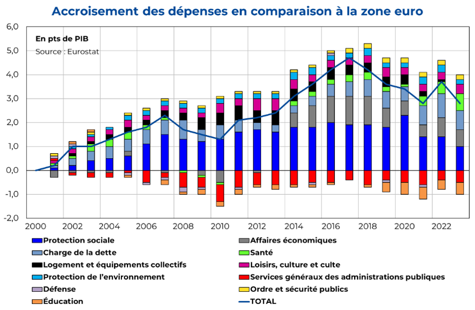 Le changement de statut de la dette française s’inscrit en réalité dans un temps long de dérive des finances publiques : le ratio d’endettement a progressé plus qu’ailleurs à partir des années 2000 et cette tendance s’est accentuée à partir de 2013. Le cycle économique ne saurait être invoqué, car c’est bien l’accroissement de la part des dépenses, en particulier celles liées retraites, qui explique cette situation.