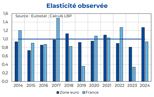 Nous observons qu’à partir de 2023 (cf. graphique 9), l’élasticité pour la France chute à un très bas niveau, bien en-dessous de l’unité et environ deux fois plus faible qu’en zone euro. L’élasticité observée augmente en 2024 mais demeure toujours nettement inférieure à celle en zone euro. Sur cette période, la croissance des recettes a ainsi été nettement plus limitée en France qu’en zone euro pour un rythme de croissance donné.
