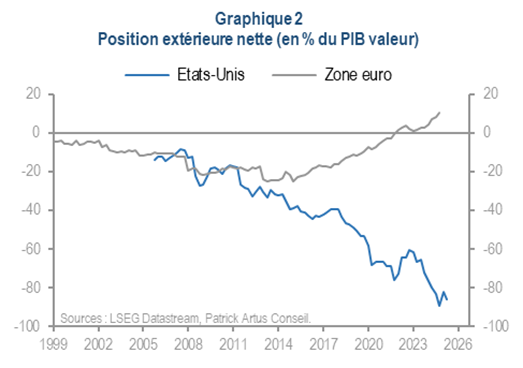 Les conséquences de ce recul seraient très négatives pour les Etats-Unis : il s’agirait de la disparition du « privilège exorbitant du dollar ». En raison de son rôle de monnaie internationale dominante, le dollar permet en effet aujourd’hui aux Etats-Unis de financer sans difficulté un déficit extérieur considérable et une dette extérieure colossale (graphique 2), les résidents des autres pays acceptent d’accroître de manière pratiquement illimitée leur détention de dollars (en raison de la sécurité de cette détention, de la liquidité des marchés de dette ou d’actifs financiers en dollars).