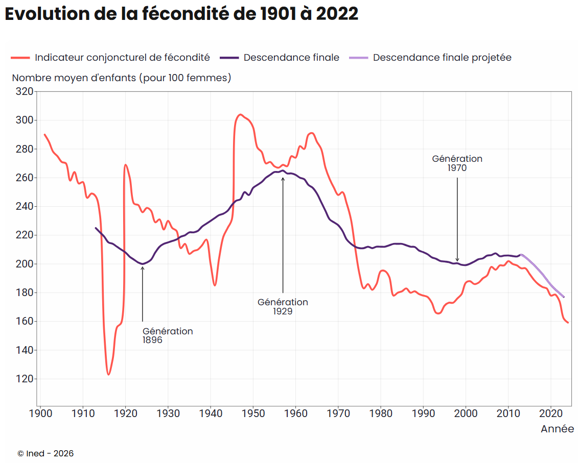 Il faut avouer que la rapidité et la durée de la baisse de la natalité au cours des 15 dernières années ont surpris. Cette baisse du nombre des naissances ne s’explique pas par la baisse du nombre d’hommes et de femmes en âge d’avoir des enfants, mais bien par celle de la fécondité à un âge donné, qui est résumée dans l’indicateur conjoncturel de fécondité (ICF) qui est passé de plus de 2 enfants par femme en 2020 à moins de 1,6 en 2025. On a déjà connu des périodes de baisse de la fécondité en France, dans les années 1980-1995 notamment. Mais ces années de fécondité -relativement- faible s’expliquaient en partie par une modification du calendrier des naissances (l’âge moyen des mères à la naissance du 1er enfant est passée de 24 ans en 1970 à 29 ans en 2023), et pour partie aussi, par la conjoncture économique. Au final, toutes les générations de femmes -et d’hommes- vivant en France ont eu plus de 2 enfants en moyenne jusqu’à la génération née en 1985.